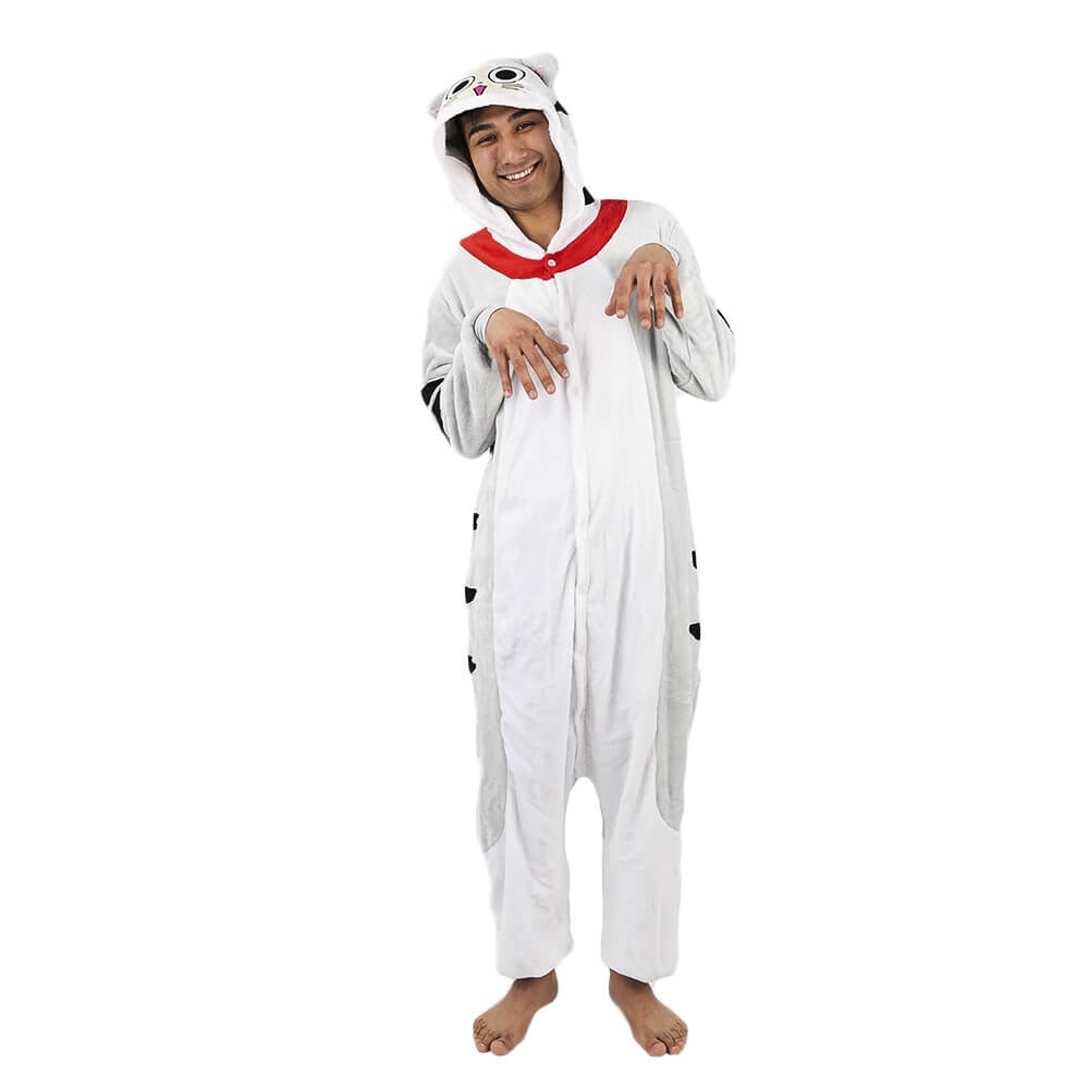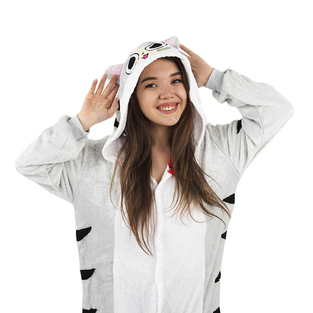 Котенок Чи – персонаж из мультфильма аниме. Кигуруми выполнен по мотивам этого мультфильма, а дизайн придает схожесть с персонажем. Бело-серая расцветка смотрится свежо и нарядно. Черные полосочки на хвосте, по бокам и на капюшоне придают игривости образу. Мордочка выполнена в технике аппликации с элементами вышивки.