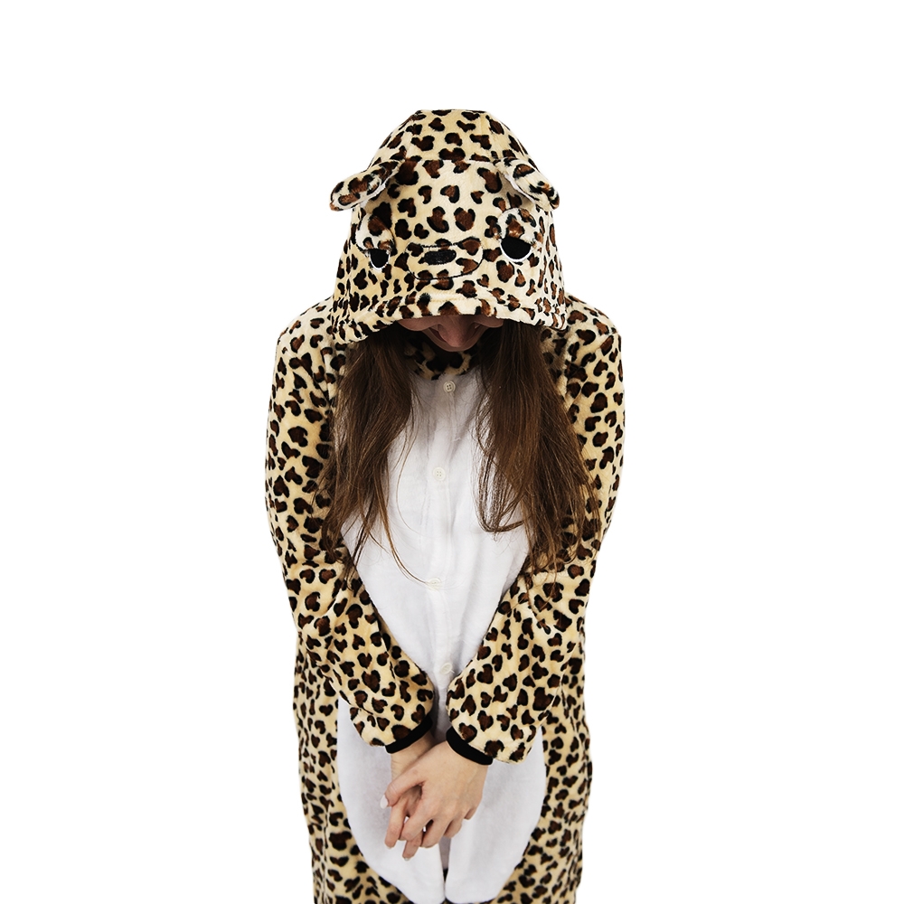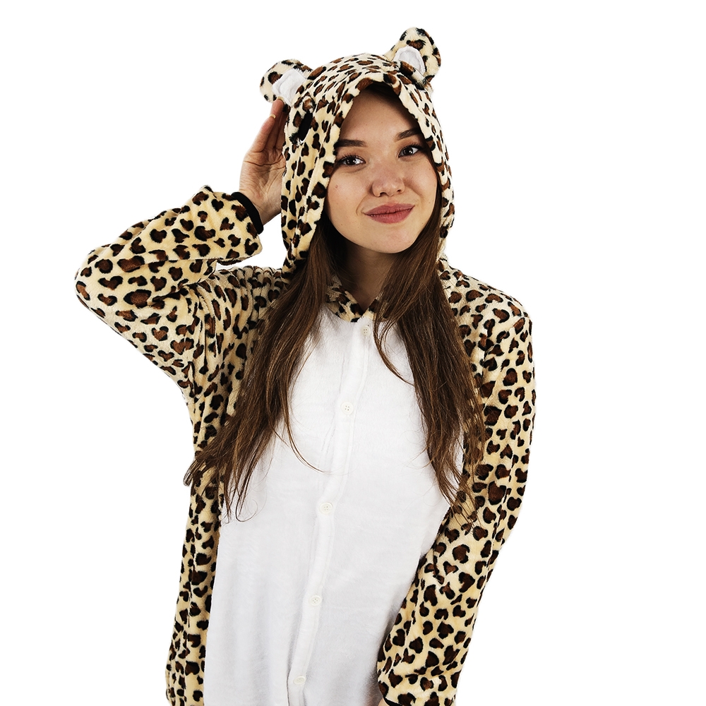 Леопард – дикое, грациозное животное. Оно отличается невероятно красивой пятнистой шерсткой. Именно такая у нового кигуруми для взрослых, которое подойдет парням и девушкам ростом 165-175 см. Эффектный, яркий дизайн привлекает внимание и дарит положительные эмоции. На капюшоне изображена мордочка леопарда: вышитые нос и глазки, объемные ушки и веки, а сзади – короткий хвост.